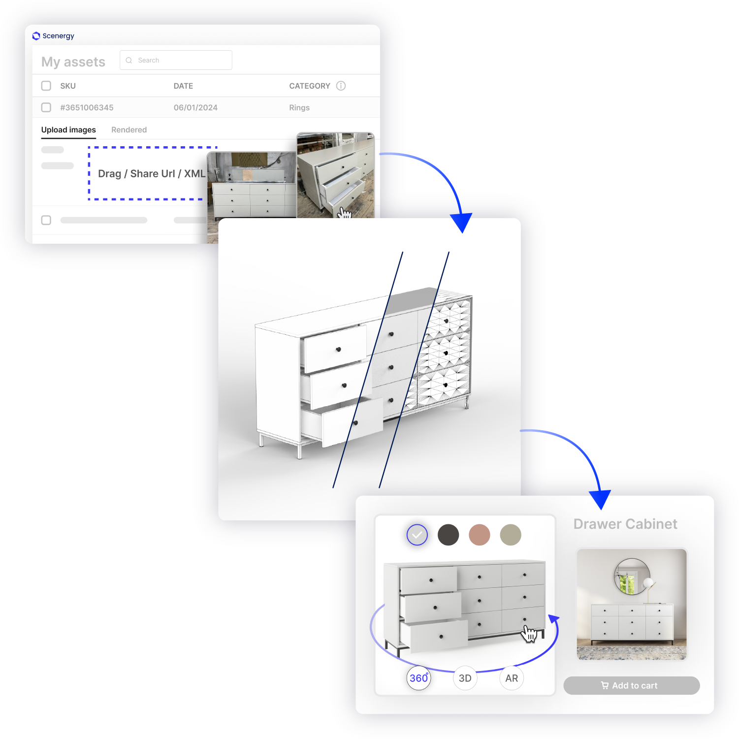 Add 3D renders and virtual photography directly to your site, or display them via our 3D/360º Viewer, 3D Product Configurator, Augmented Reality, or Virtual Try-On tools.
